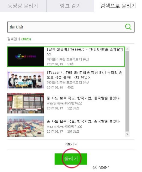 It ONLY searches on Naver. Put your keywords in the box and click on the GREEN search symbol for results. Choose a video and then click the “Upload” button to add it to your post. I have not used this option yet myself.