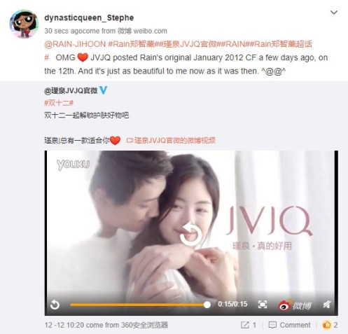 12/12/2019. It’s been a good minute since Rain’s 2011 to 2016 years with J.VJQ, but they definitely know a good thing because recently they re-posted his gorgeous 2012 CF on their Weibo in China! Which I quickly re-posted on my Weibo. ^@@^