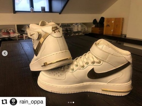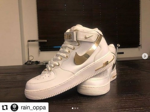 12/3/2019. Rain posted on his Instagram account what everyone took to be new pictures of his special one-of-a-kind Nike Airs that Nike sent to him back in 2008. Remember those gold beauties? It was nice seeing them again. And… there was a bit of an extra bonus, for those few who noticed it. 🙂 Look closely at the second image, upper right-hand corner… who could that be? Wife Kim TaeHee and first daughter “Raindrop” peeking to see what Dad’s doing? Some fans think it is (so do I)! 😁 But, there’s no way to really know. Rain does have a sister Hana, and TaeHee also has a sister who has daughters, as well… Rain, you are a sly one, haha! You knew what you were doing, didn’t you? 😀 ^@@^