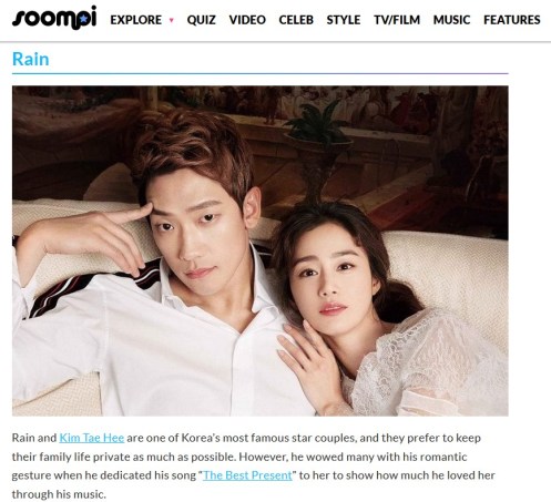 12/6/2019. SOOMPI News included Rain in their article Thoughtful Star Husbands Who Make Hearts Flutter. Absolutely, and bravo! Plus, the entire list was a thumbs up. 🙂 ^@@^