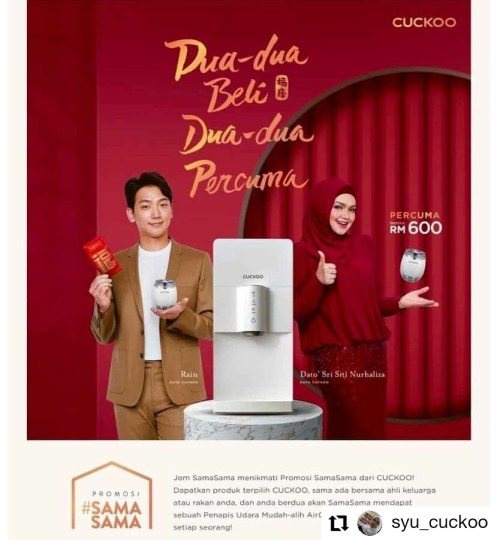 Global corporation and No. 1 healthy home appliance brand CUCKOO International has named world-renowned Korean singer-songwriter and Hallyu star Rain and Malaysian queen of pop Dora’ Sri Siti Nurhaliza its brand ambassadors for the year 2020, representing their #SAMASAMA Division (Malaysia, Singapore, Indonesia, and Dubai). CUCKOO has blasted this news just about doggone everywhere and, personally, I think it is truly a smart move on their part.