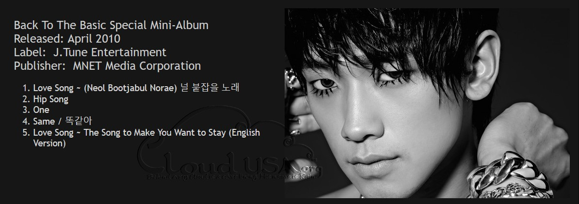 The eighth installment of my Rain Career Music special series celebrates when Rain dropped his next Korean offering, mini album Back To The Basic, in April 2010. There was also a Japanese edition (in Japanese), and a Chinese/Taiwanese edition. We had just gone live on January 21, so Cloud USA was only 3 months old, babes in the woods during our first Rain music comeback! An exciting and tiring time indeed, as his comeback trail was KILLER, he did not and does not play! (Want proof? Go here to our old Rain on the Horizon History Page and check out April and May 2020. Whew! We were tired and overwhelmed, and poor Rain was so exhausted that he collapsed with the flu at a TV taping and scared us all half to death. Never fear, though — he rallied back strong! Pardon the mess on our homepages — we’re in the process of moving our site to a new host.) ^@@^