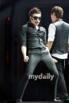 Rain probably had just finished a long session of dance practice. His hair was very wet, making his hair style look like the “kimbab” style in cartoons^^. He was wearing jeans and the same red training outfit which he wore before when he had a signing event in Myung Dong.