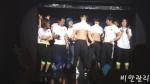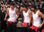 We’ve seen the broadcast footage, sure, but not the fan cam. The crowd was screaming as if they were being killed. The fans around the fan-cammer were in flat-out convulsions. Ohh, there’s KyuSang, YongDeock, SungTak, Gori, Hongshi… and is that NamYong?? *scream* Rain was seducing everyone who could see him. Look at that sly grin! Look at his reaction when he hears his name—sheer pleasure. Heh. If you don’t damn near pass out watching this, you have a strong constitution, my friends, because this is gold.
